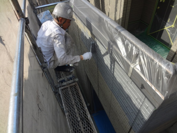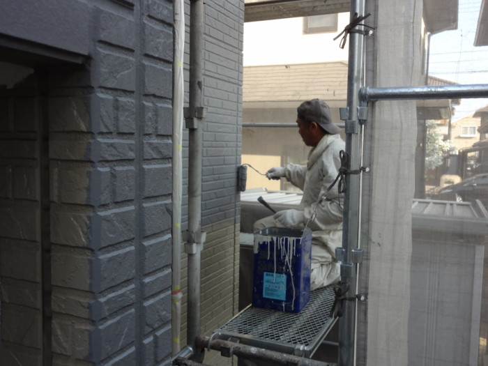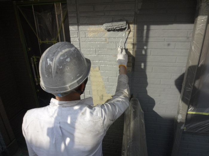西面GAINA(ガイナ)N-50中塗り塗装作業風景🎶入りにくい目地にも綺麗に入れていきます(#^^#)