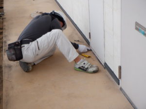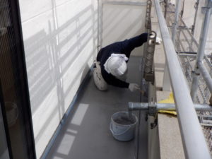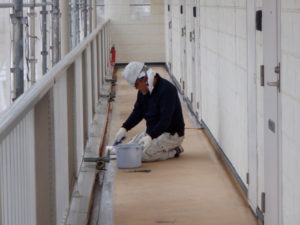 本日の作業(防水)ベランダ上塗り&玄関側通路プライマー&メッシュシート施工