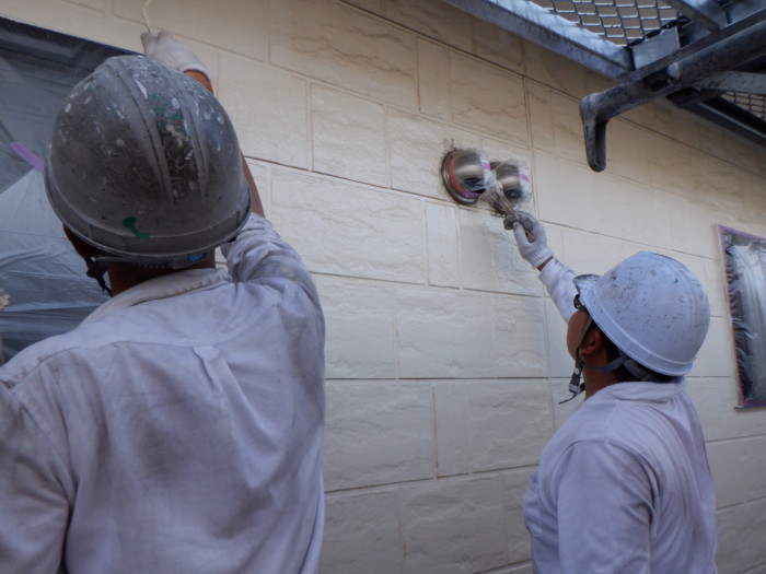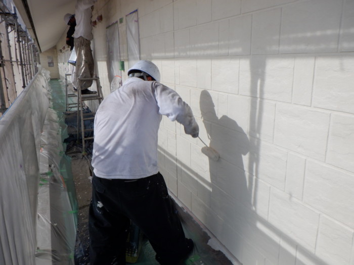 GAINA(ガイナ)外壁上側中塗り北面→東面(ベランダ)→南面→西面(共用廊下)の順に塗っていきました(#^^#)