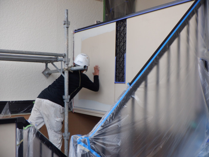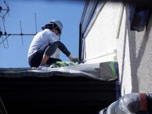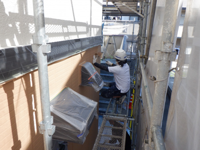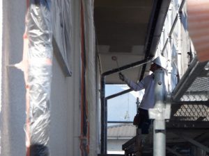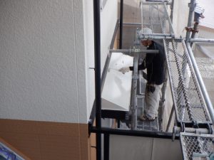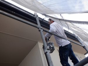 付帯部塗装1回目(鼻隠し、軒樋)作業風景(*^^)v